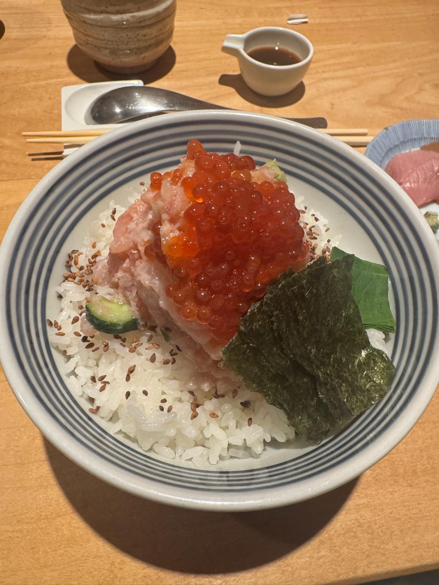 The weather was pretty gross (cold, windy, and rainy), so we walked a bit to a seafood bowl place for dinner (Nihonbashi Kaisen Don Tsujihan - Ark Hills Branch) before going to a very high-up cocktail bar (Rooftop Bar Andaz Tokyo Toranomon Hills). The cocktail bar was very high up, so the views of Tokyo were really cool, but the open air made it a bit chilly. (Also, getting to the bar was quite an adventure; we went through multiple unmarked doors and had to click an elevator button that looked like a rock, but ultimately we made it).